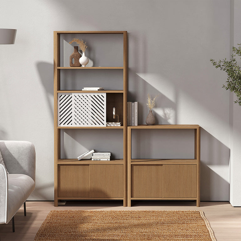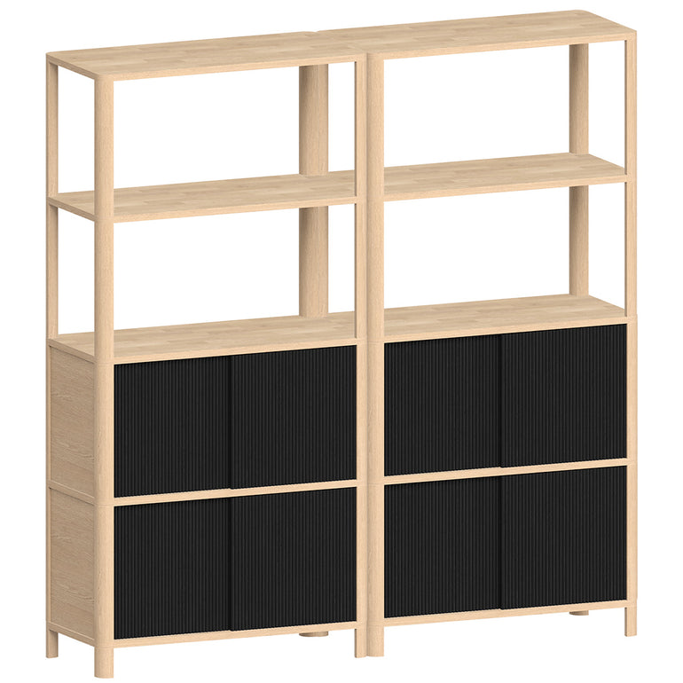 Side and back panels of the closed modules: MDF fiber with natural Oak wood veneer.