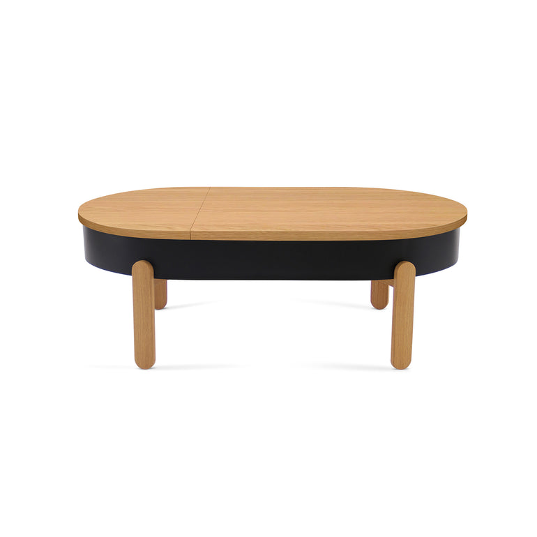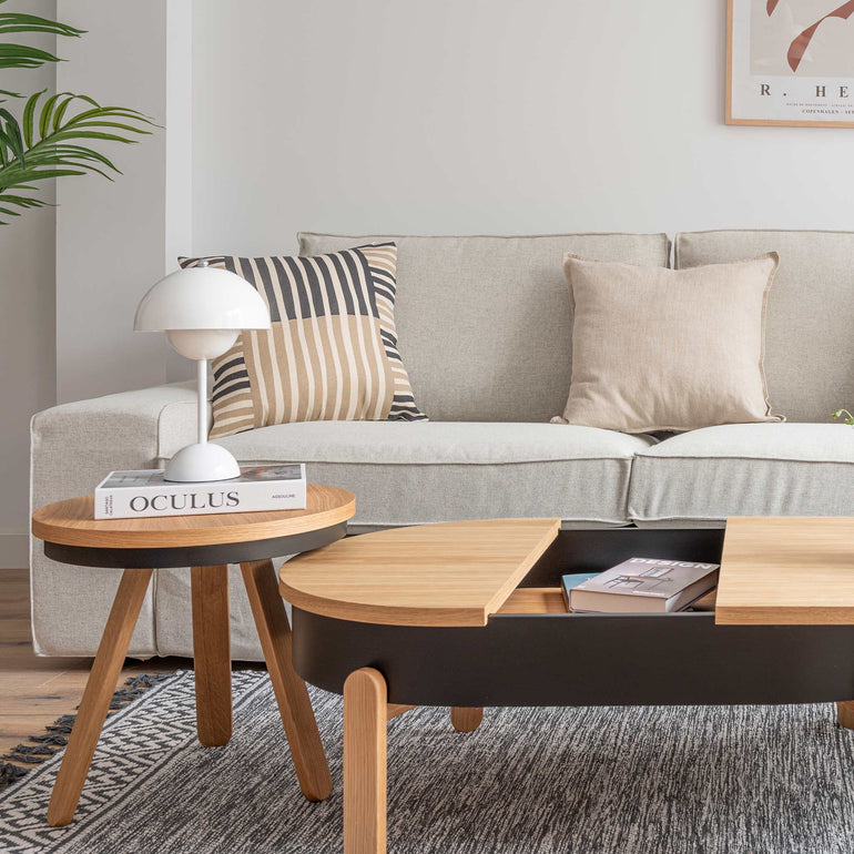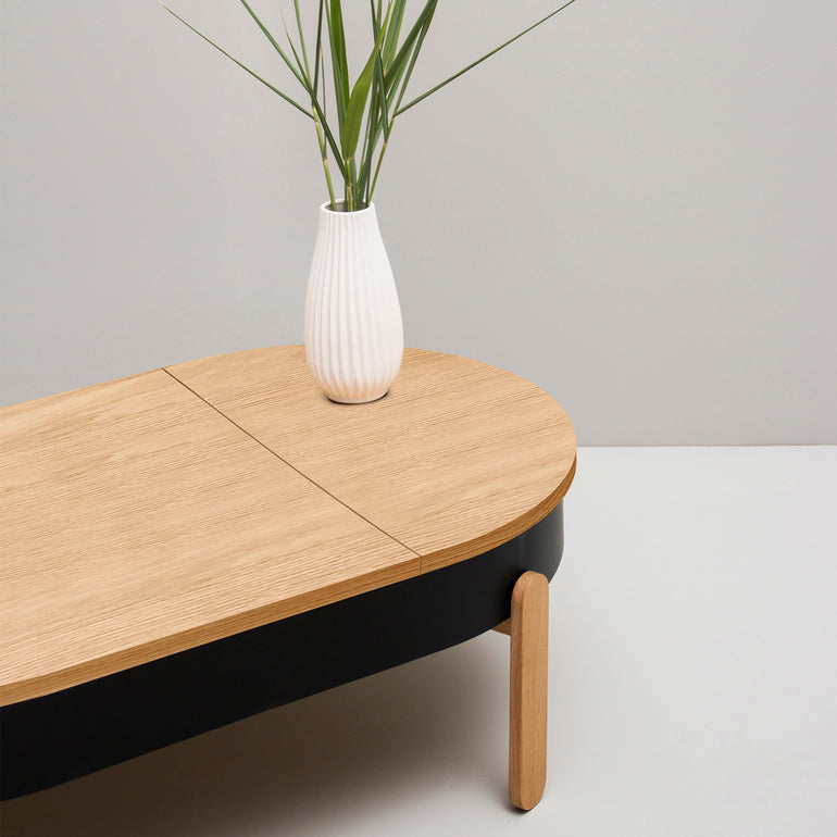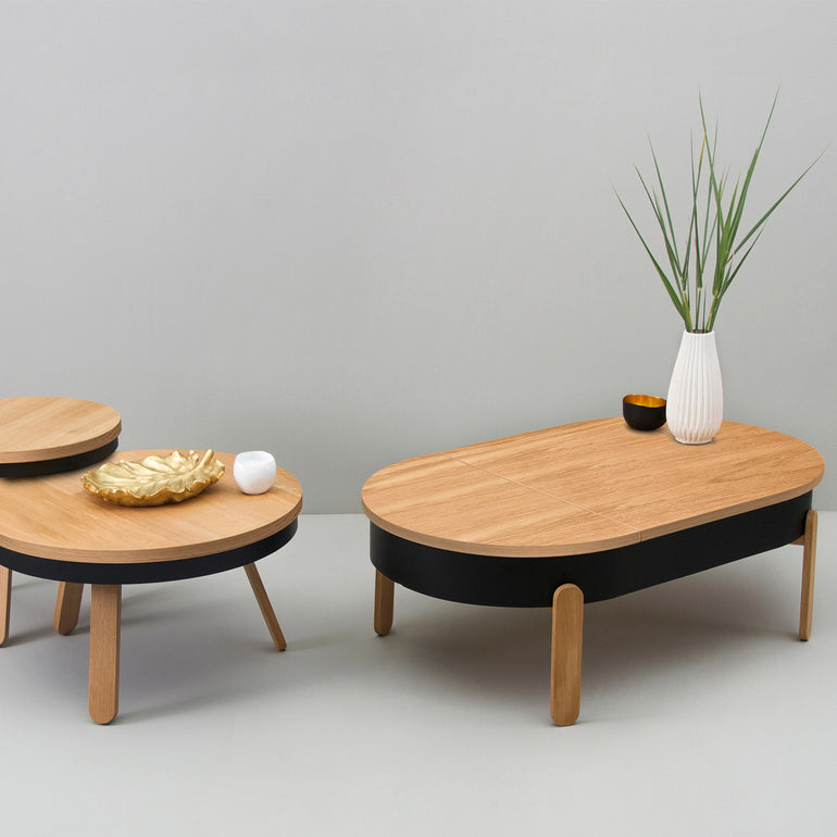 Le plus grand membre de la famille Batea dispose d’un espace de rangement qui s’ouvre lorsque le plateau glisse. Une table basse avec rangement soigneusement conçue qui allie artisanat et modernité, s’adaptant à la dynamique de chaque espace.