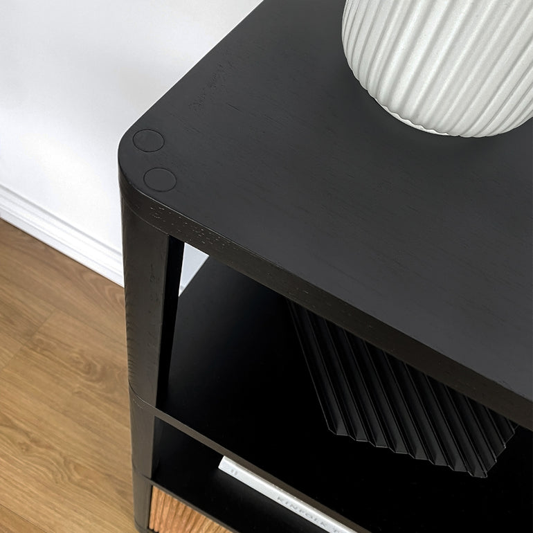 Side and back panels of the closed modules: MDF fiber with natural Oak wood veneer.