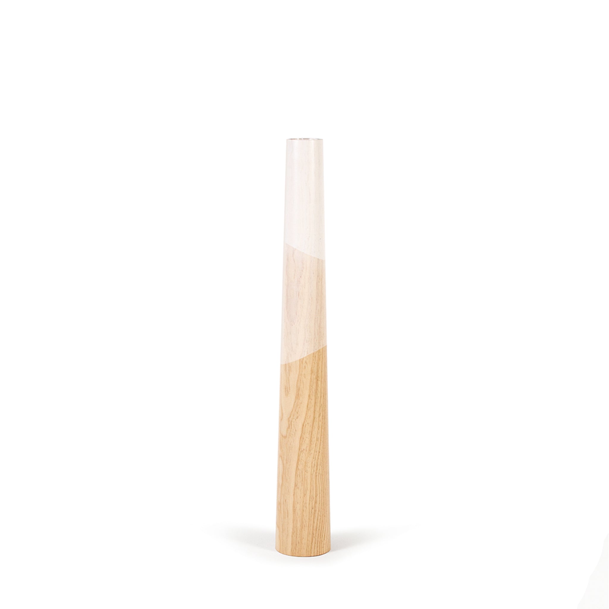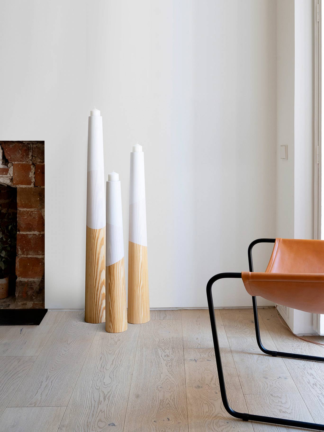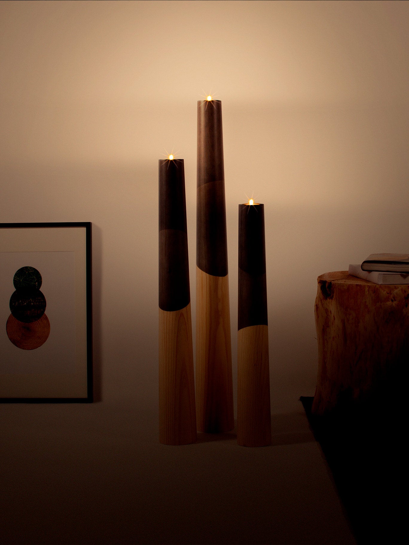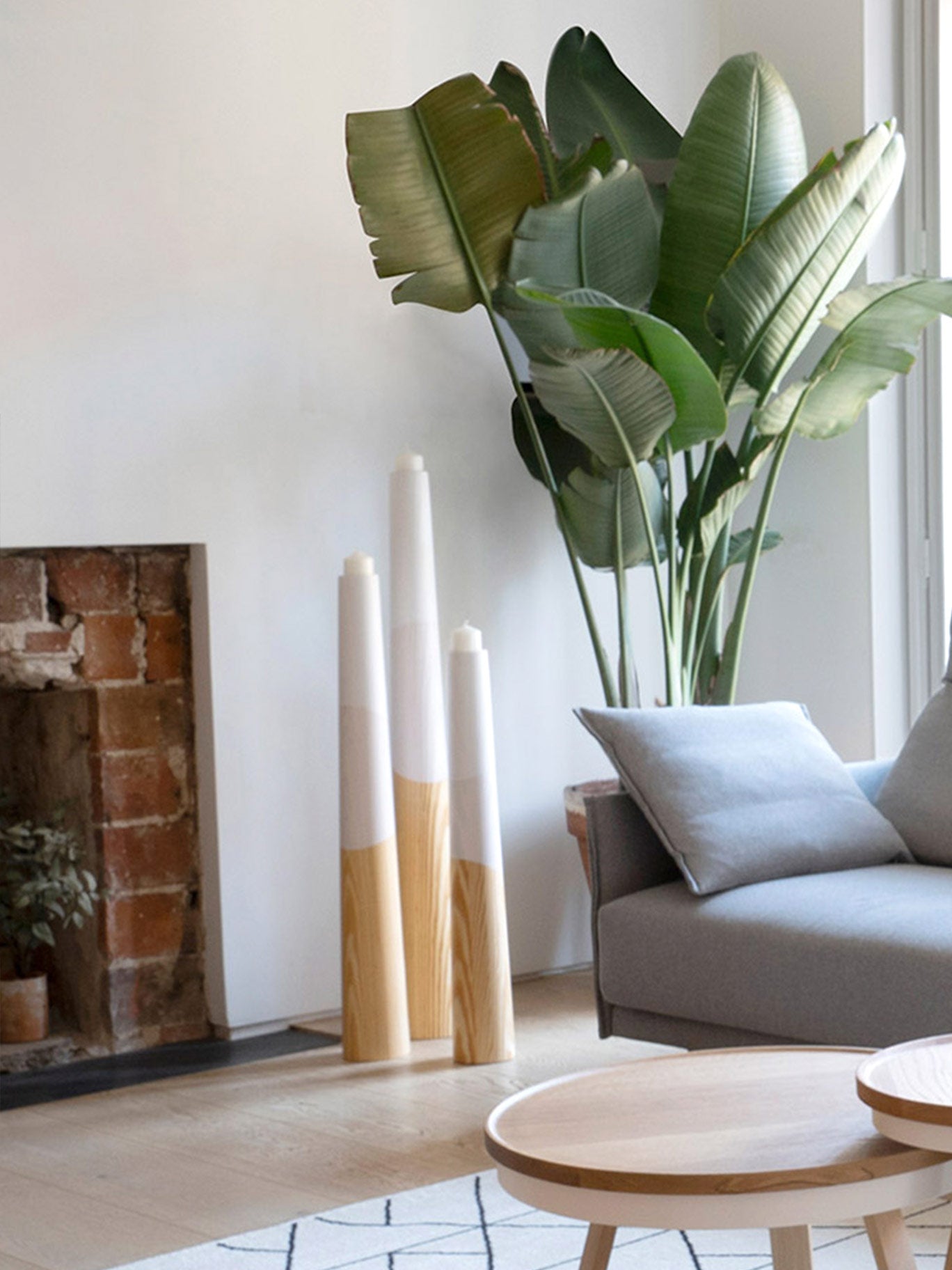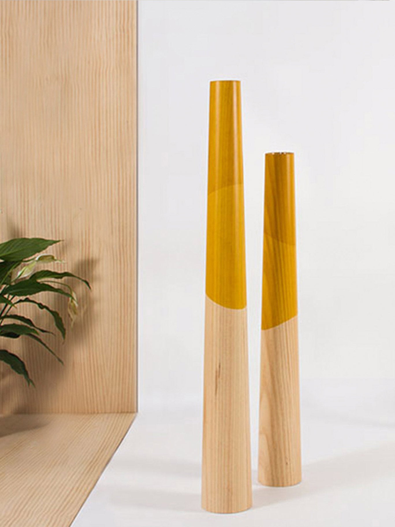 A collection of large standing wooden candle holders, ideal to give a touch of light and color to any environment. Simple and clean lines with a conical shape made of solid wood, and a design inspired by nature.