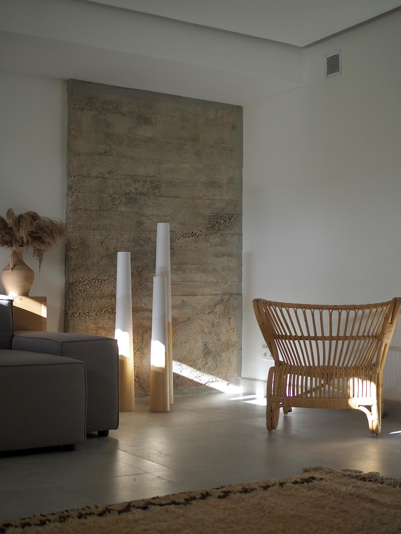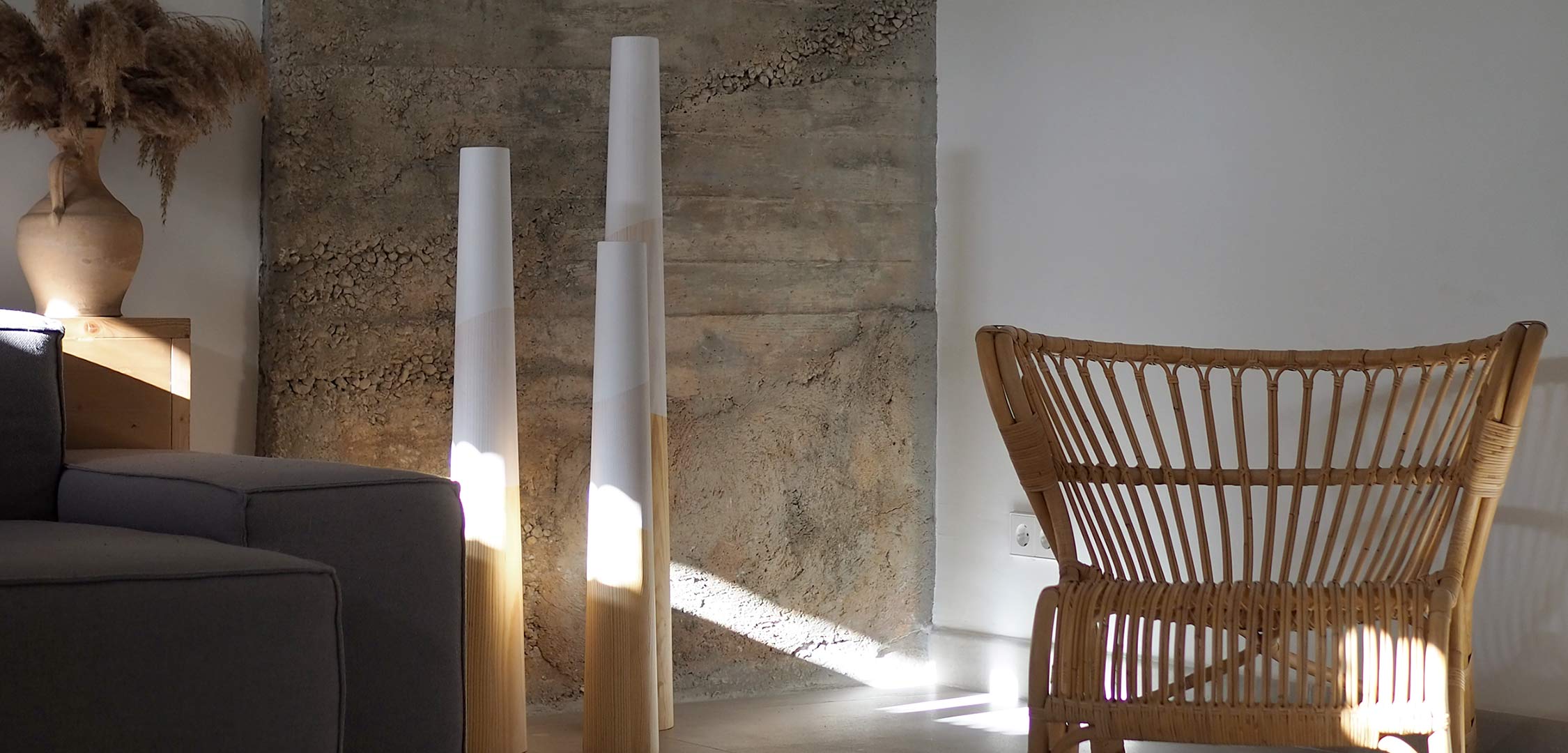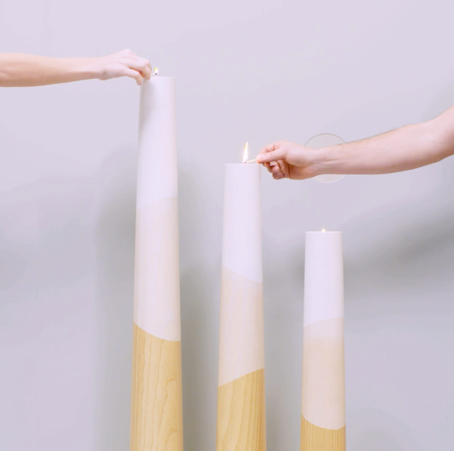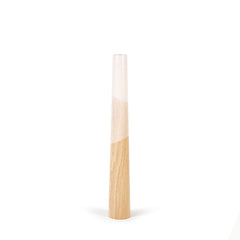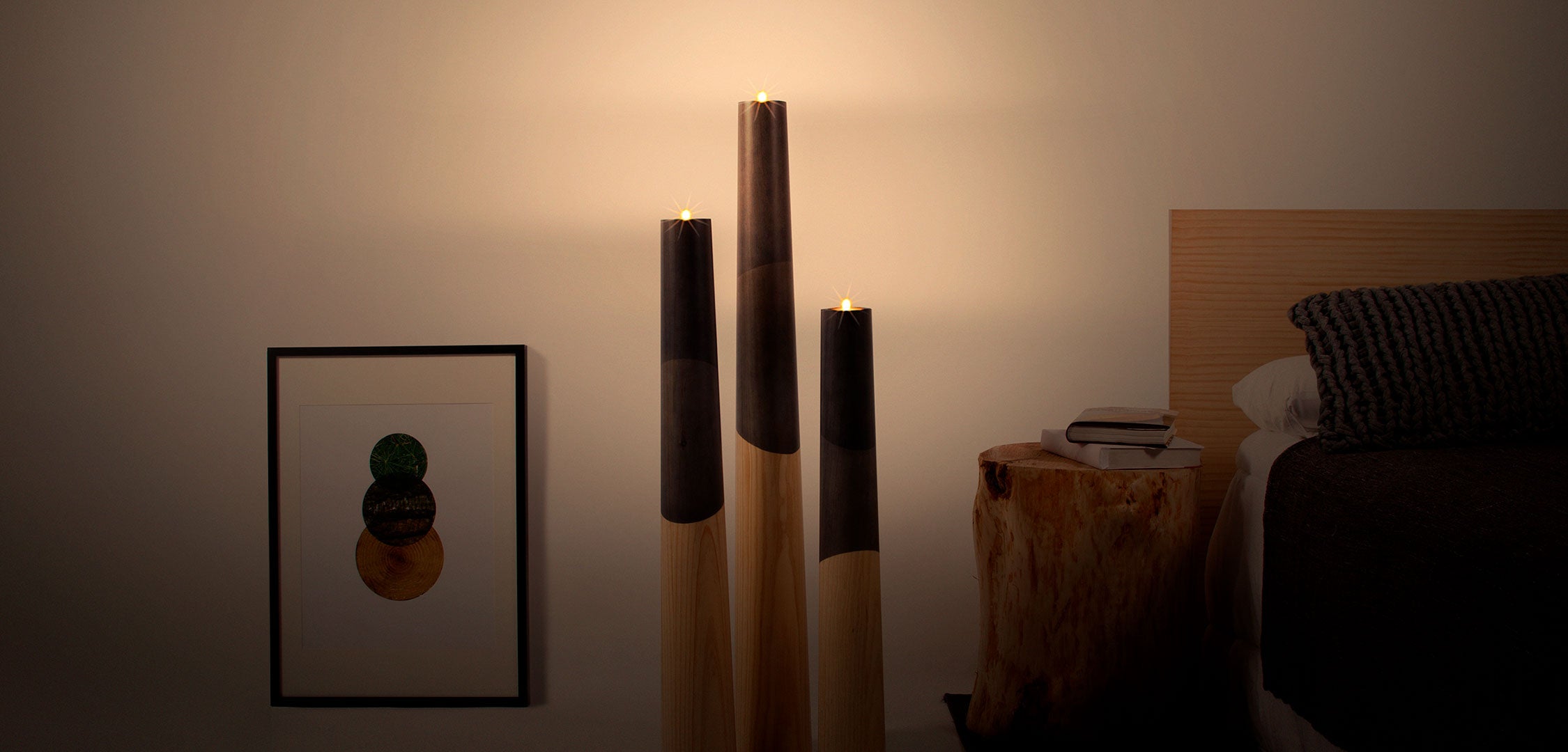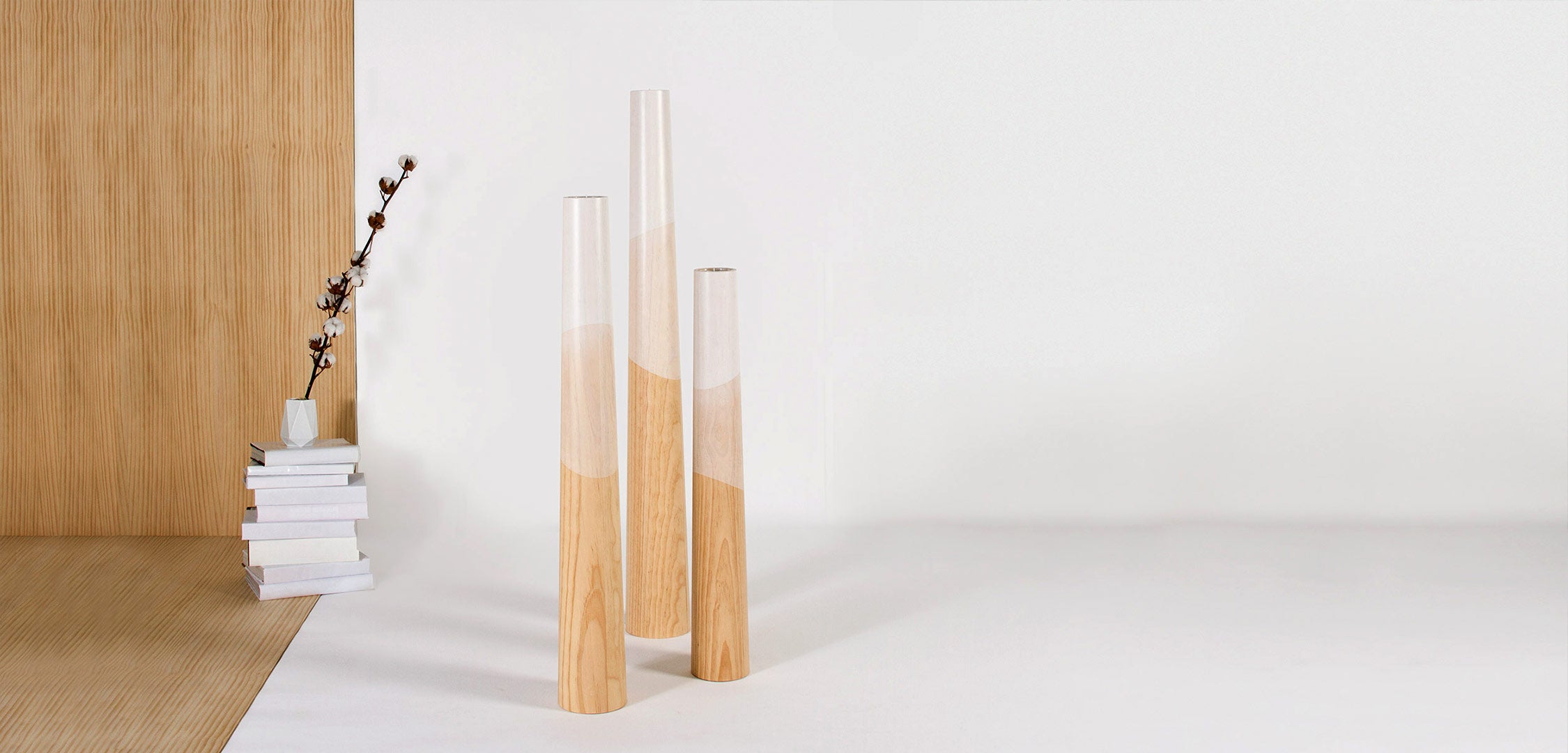 A collection of large standing wooden candle holders, ideal to give a touch of light and color to any environment. Simple and clean lines with a conical shape made of solid wood, and a design inspired by nature.