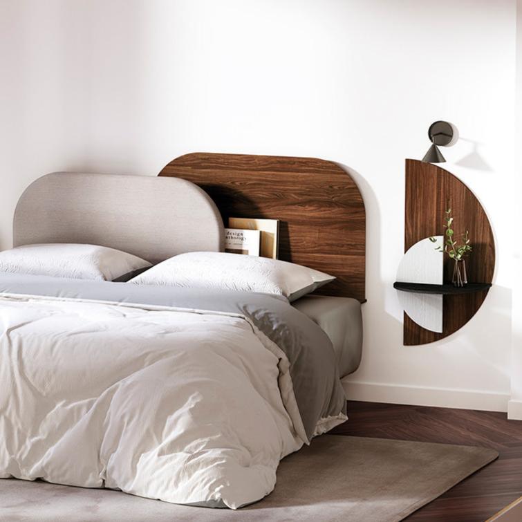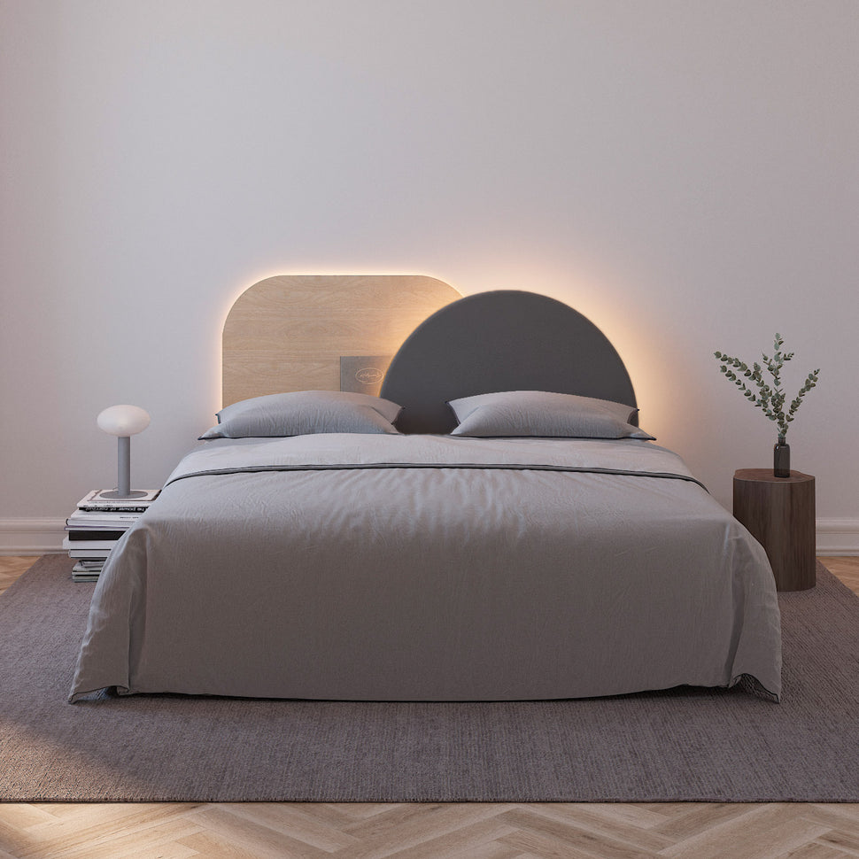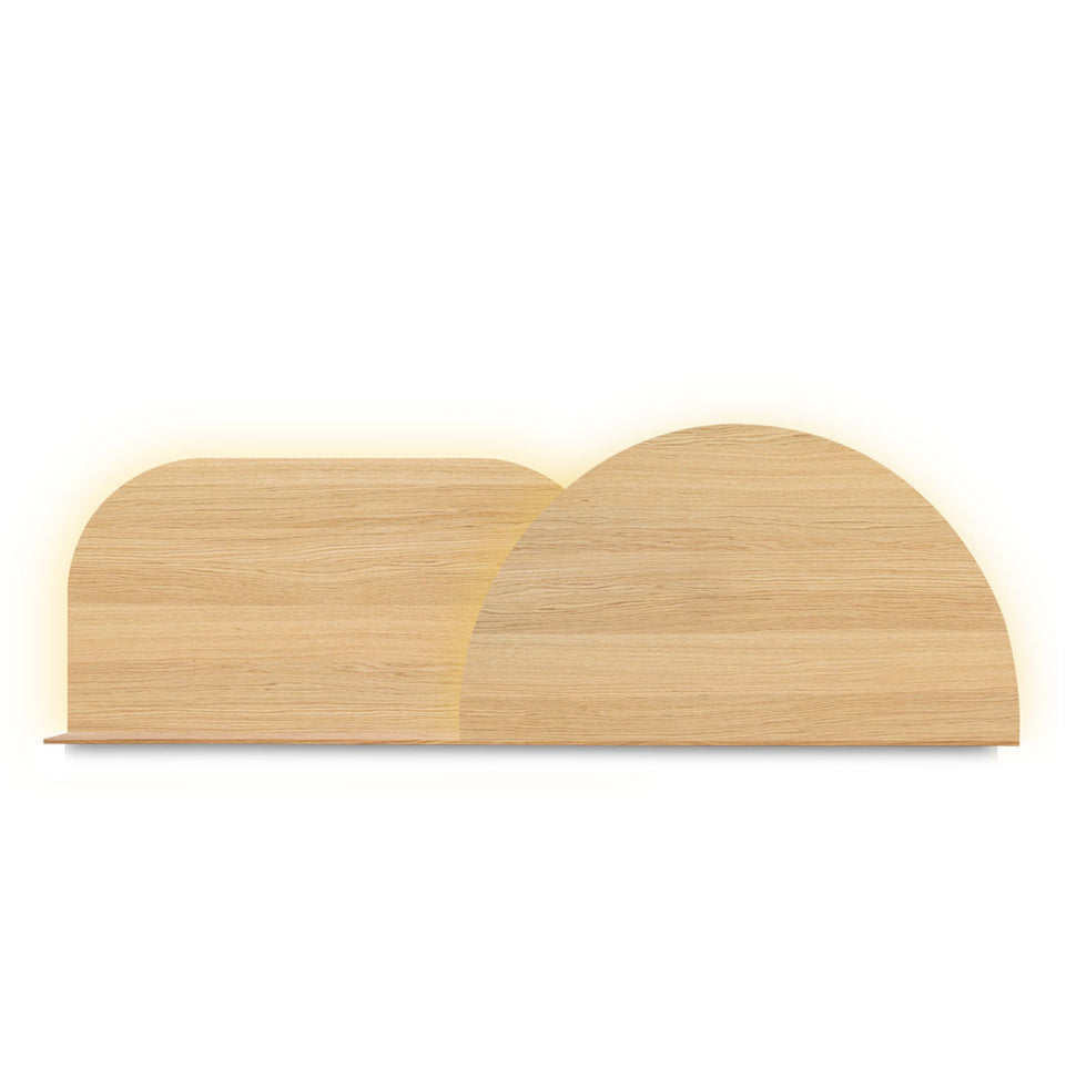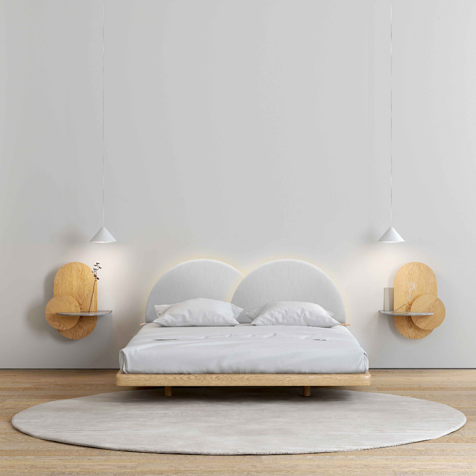 Our Alba Headboard consists of two panels that overlap in the center, available in either sustainable wood finish or beautiful textile, and combined with a hidden shelf for small everyday items. Easily decide at home how to install them thanks to all panels being interchangeable. The piece is completed with the possibility to add minimalistic dimmable backlighting.