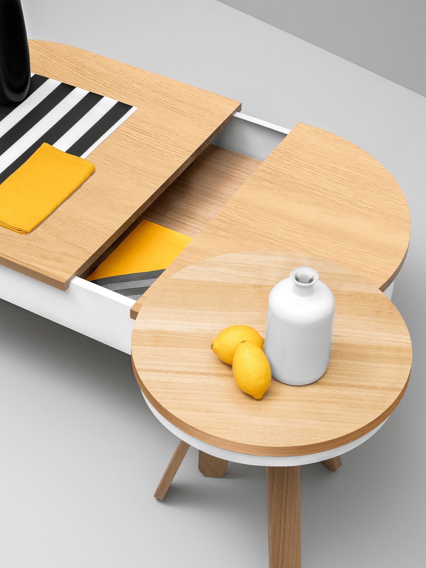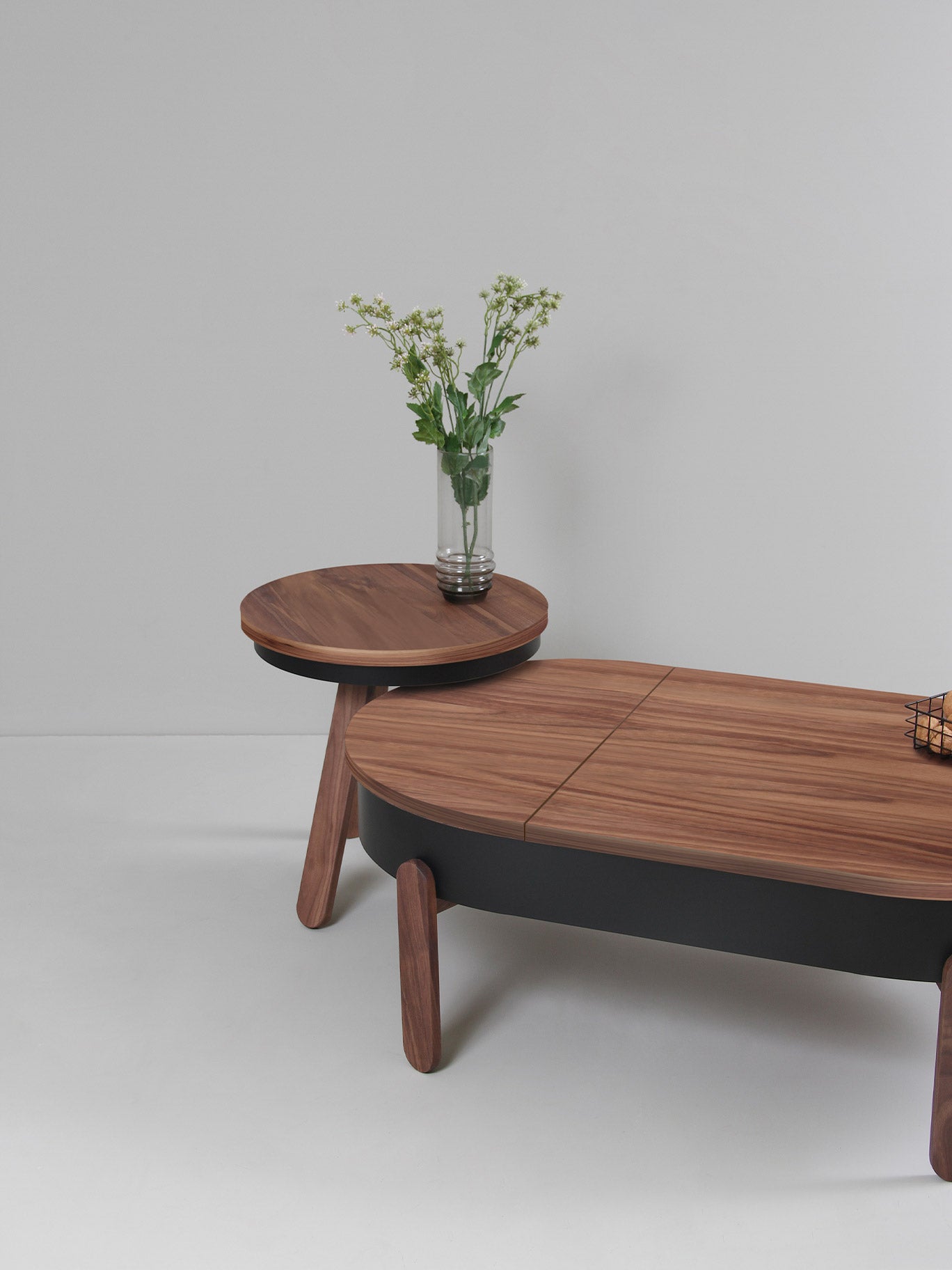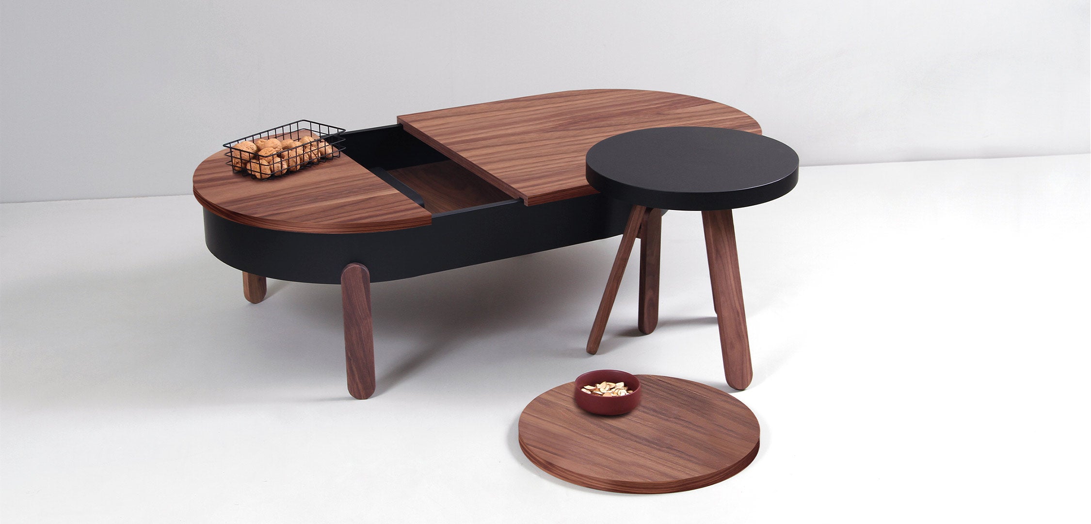 This coffee table and tray table set offers you a unique combination. Batea L, has a large storage space under its lid that works by sliding it easily with your finger. Batea S is a side table that has a removable tray that works separately and offers extra functionality for you to carry food or drinks in a simple way.