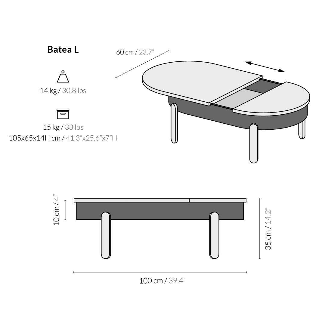 The storage space of Batea L is 10cm (4 in) deep and is the same length as the table. However, the opening to access the storage space is 28x55cm (11 x 21.6 in)