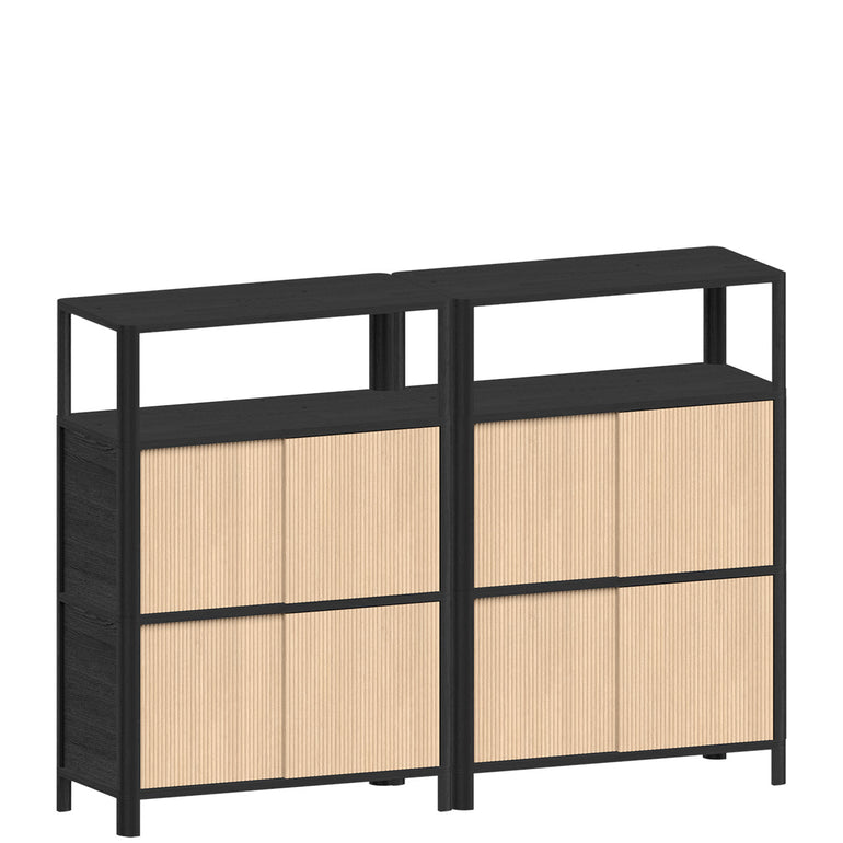Side and back panels of the closed modules: MDF fiber with natural Oak wood veneer.