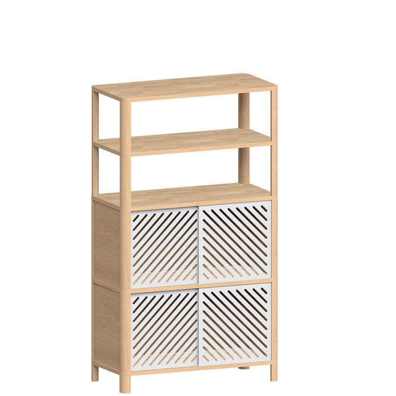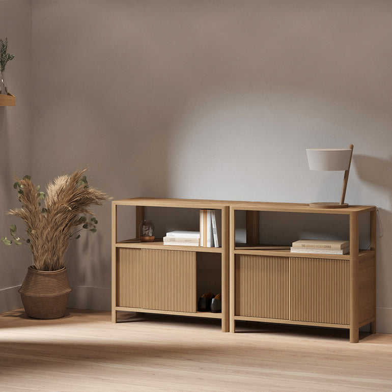 Three horizontal modules available in two different heights. A closed high module that allows to add doors, an open high module without doors, and an open short module.