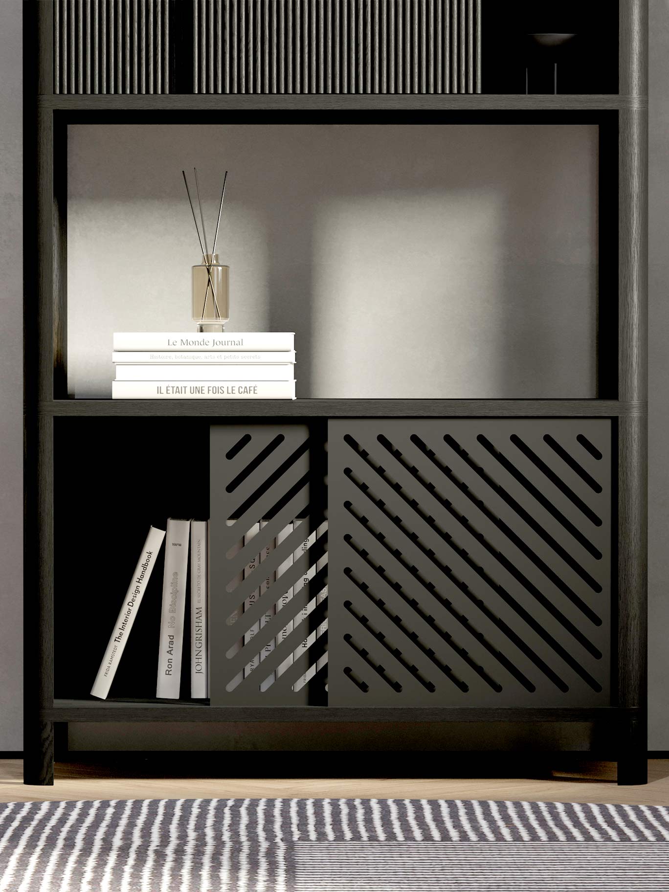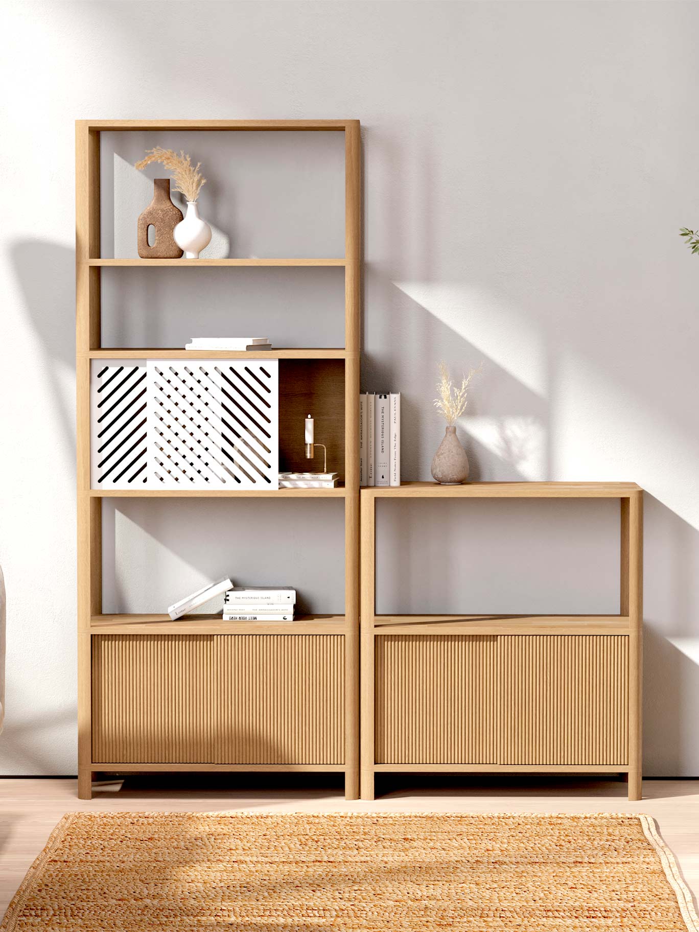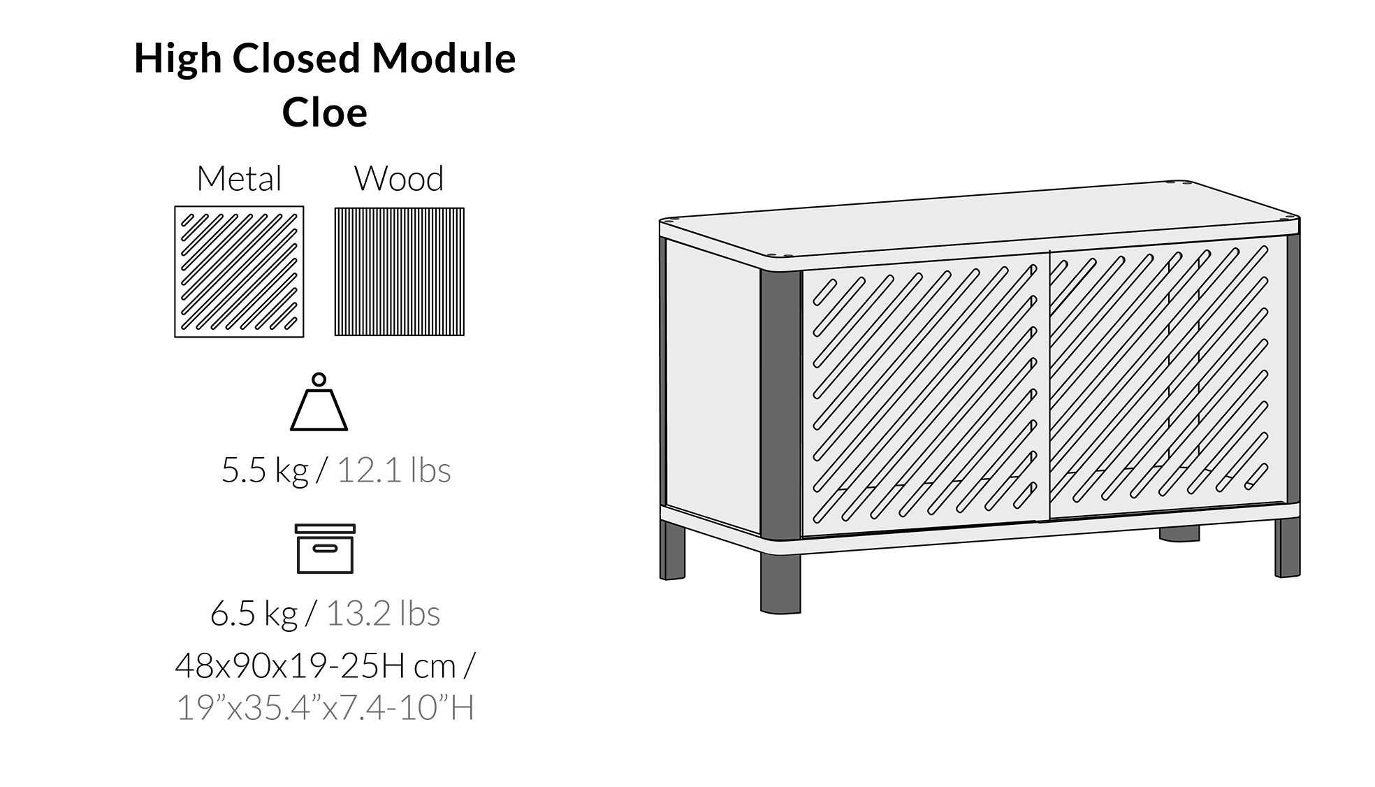 Three horizontal modules available in two different heights. A closed high module that allows to add doors, an open high module without doors, and an open short module.
