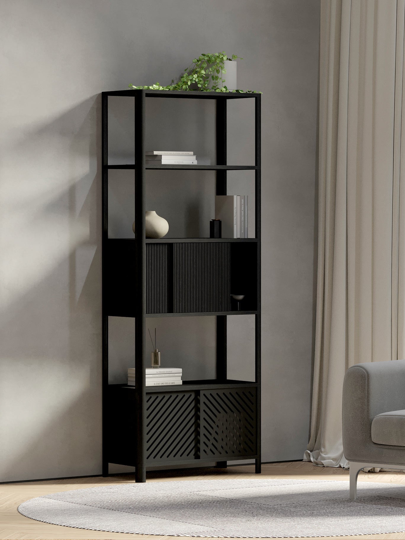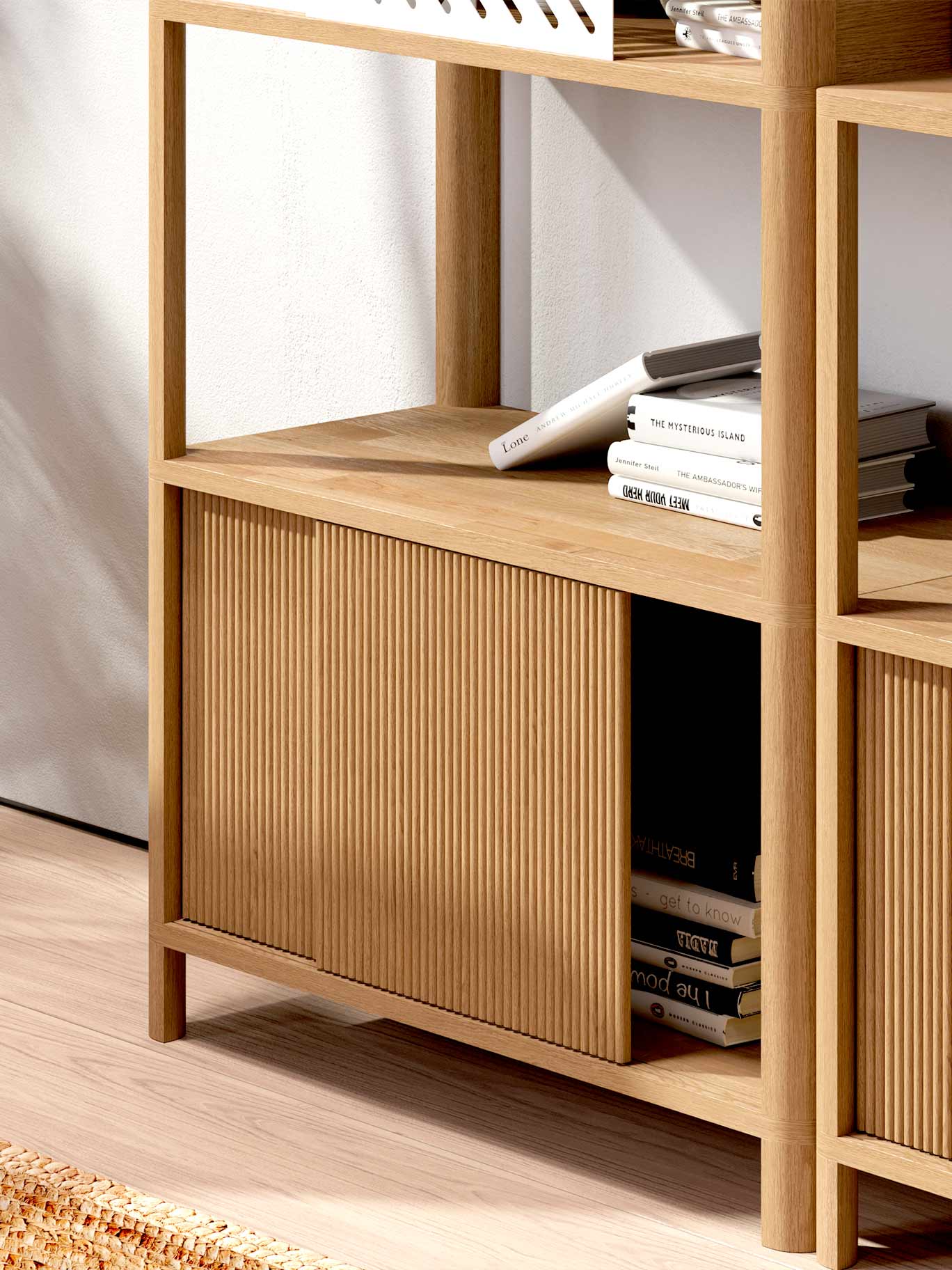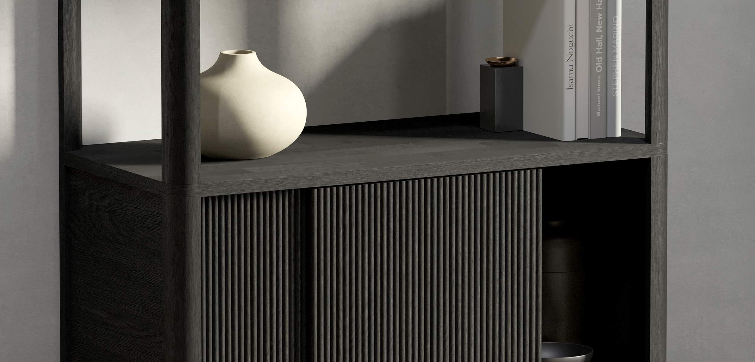 Three horizontal modules available in two different heights. A closed high module that allows to add doors, an open high module without doors, and an open short module.