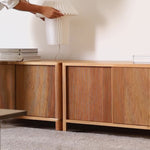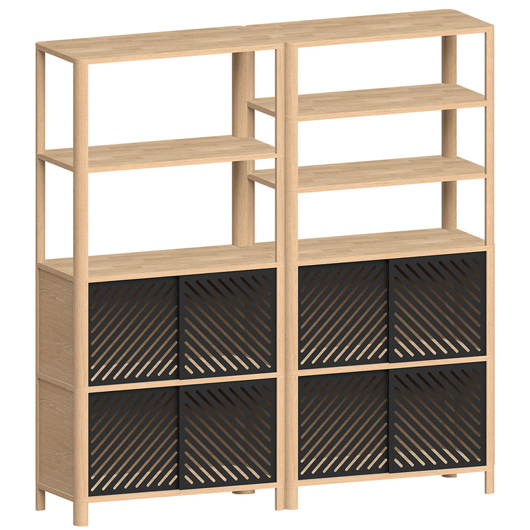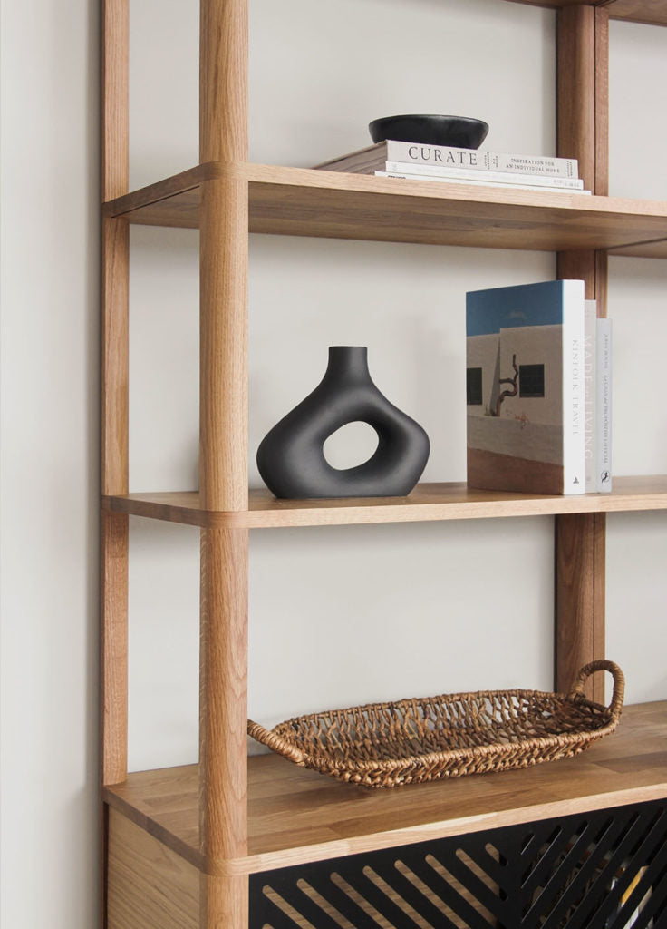 Side and back panels of the closed modules: MDF fiber with natural Oak wood veneer.
