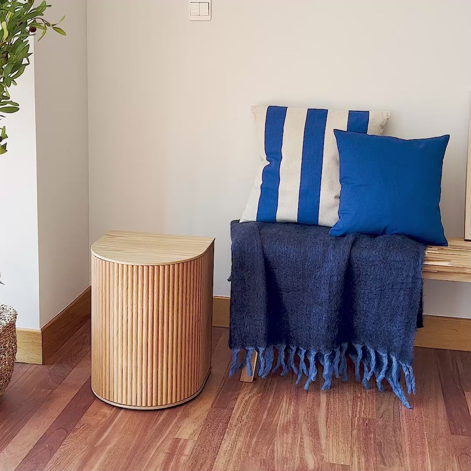 A shifting stool with the possibility of being used as a seat, including a storage space perfect for blankets or books. With an iconic texture that makes an automatic statement piece that completes a room with a memorable look. And even more functional, with its design perfectly connecting giving the possibility of connecting two stools in the center and creating a side or center table.
